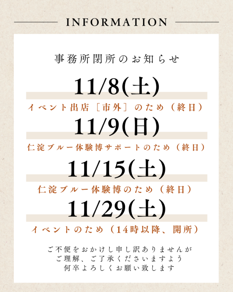 上記の日程はお電話、メール、事務所窓口での対応ができません。