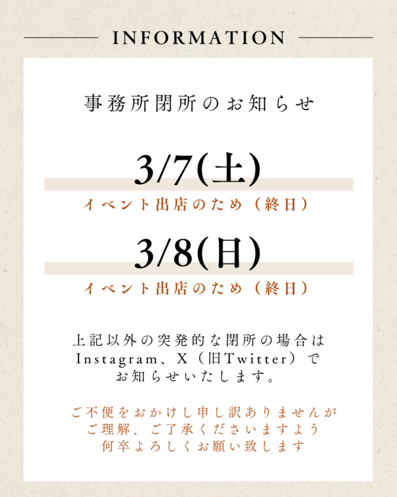 なお、上記以外に突発的な閉所が発生した場合は各SNS(Instagram、X(旧Twitter))にてお知らせいたします。