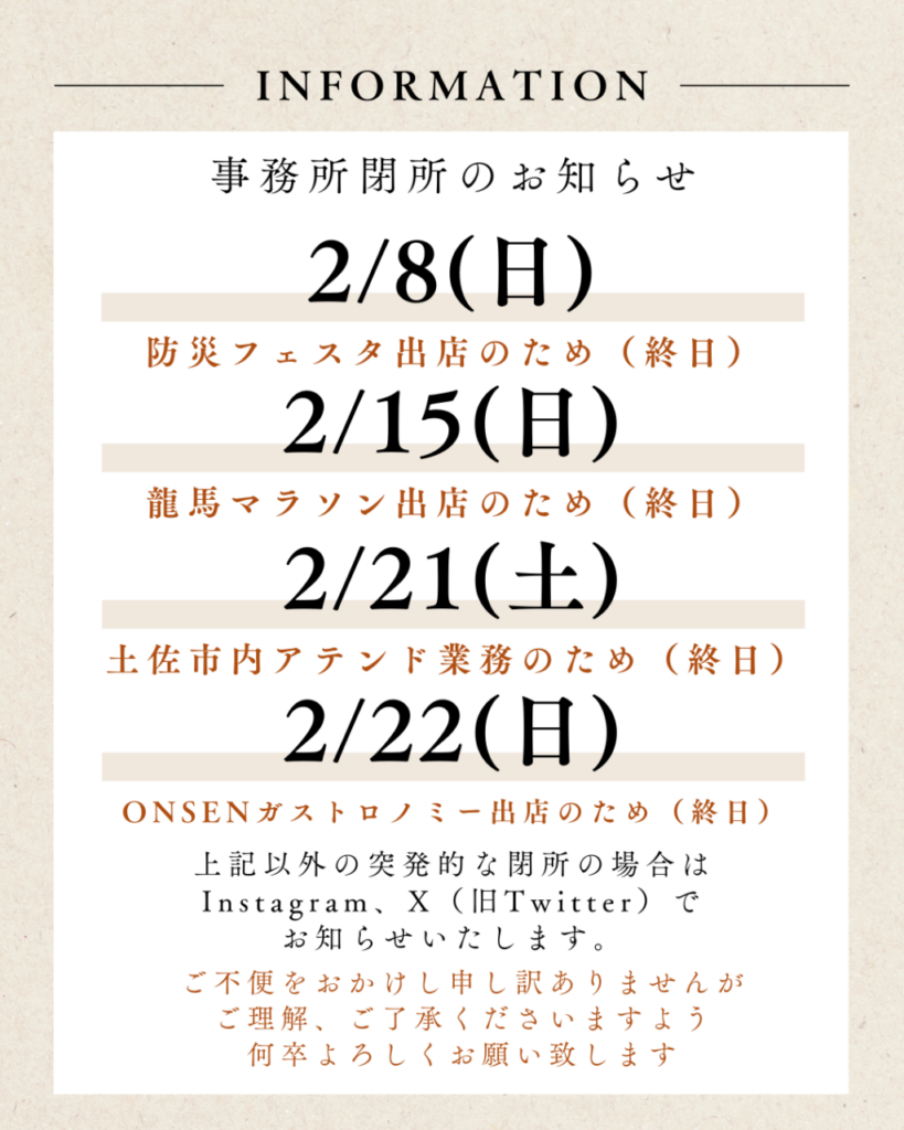 なお、上記以外に突発的な閉所が発生した場合は各SNS(Instagram、X(旧Twitter))にてお知らせいたします。
